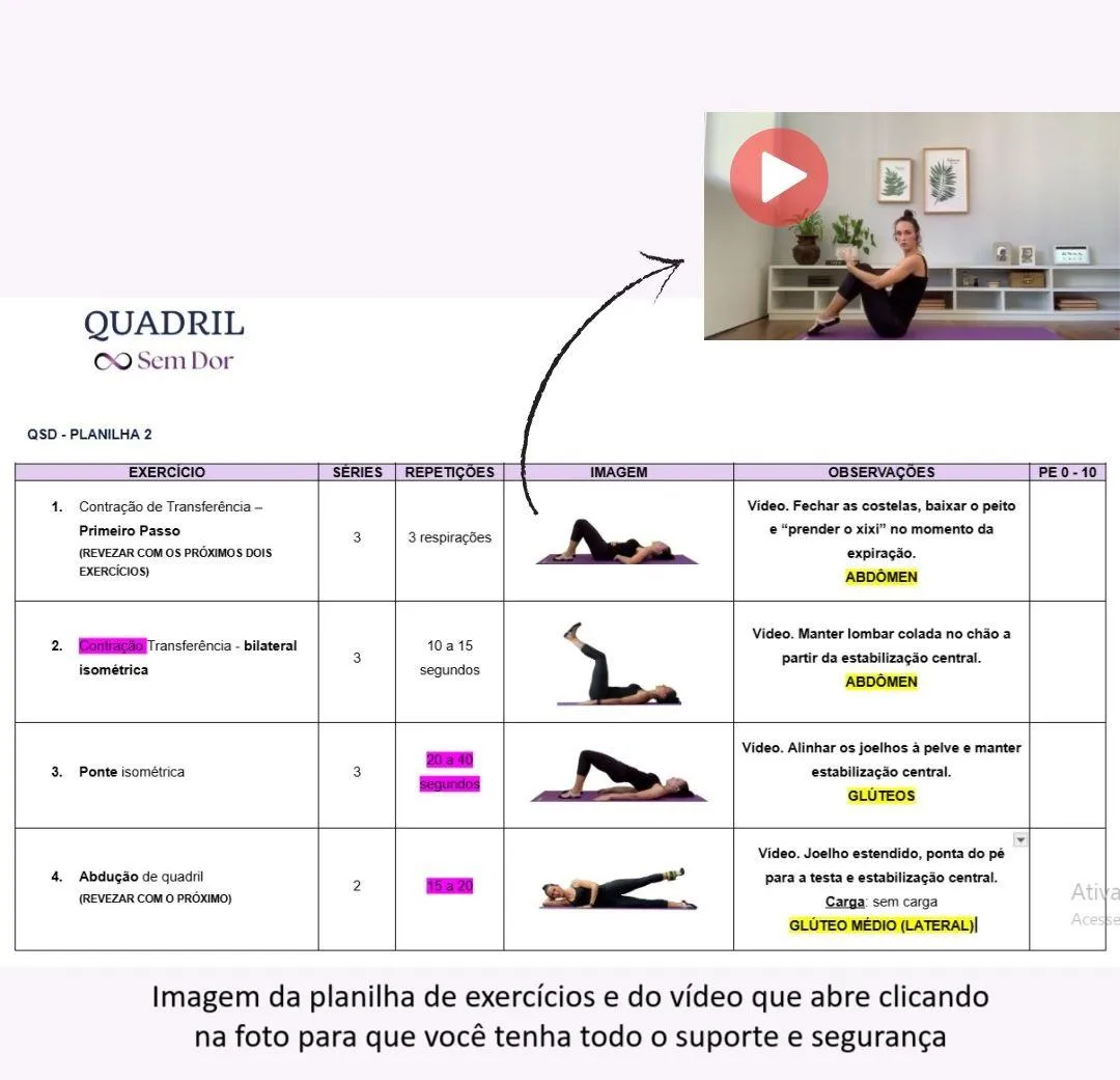 Aulas práticas de autoavaliação -para você saber por onde começar seus exercícios de forma segura - e das 3 planilhas iniciais de ativação muscular que vão criar uma base sólida para você evoluir no fortalecimento sem dor.